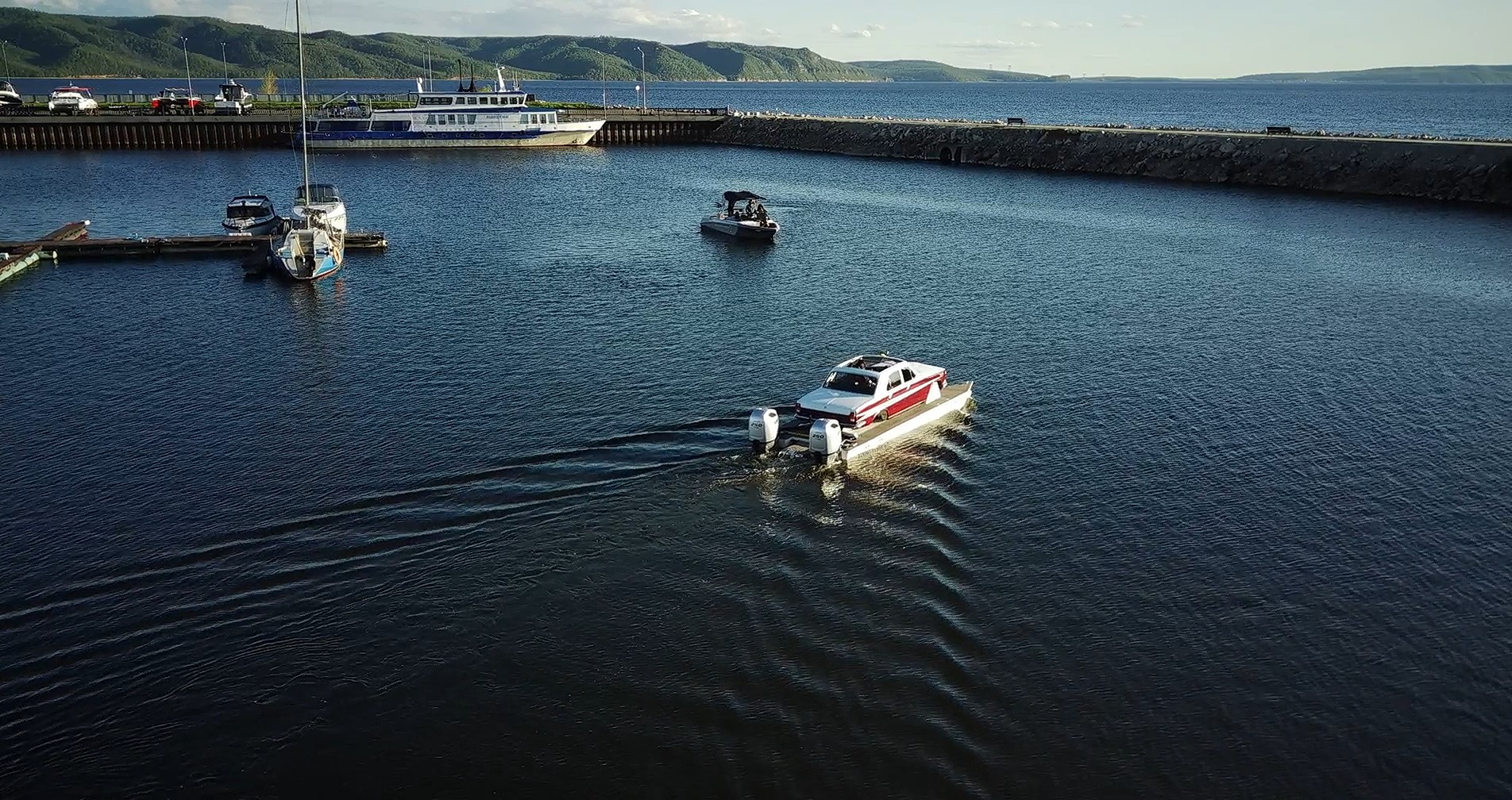 Плавающая Волга на понтонах с видом на Жигулевские горы. Съемка креативного проекта для ребят из Тольятти.