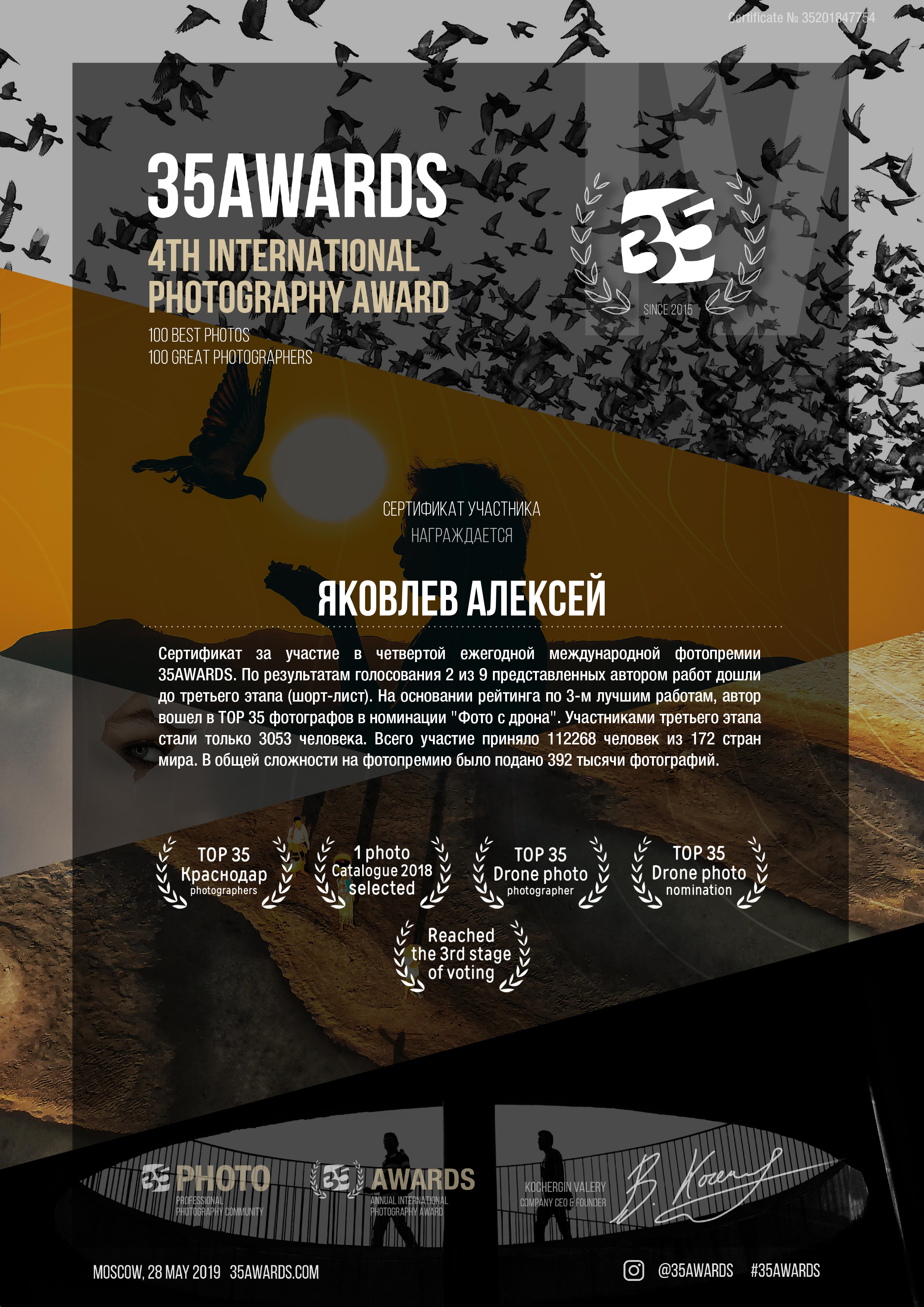 * 1 фото (с дрона) попала в каталог 4th 35AWARDS: BEST PHOTOS AND PHOTOGRAPHERS OF 2018