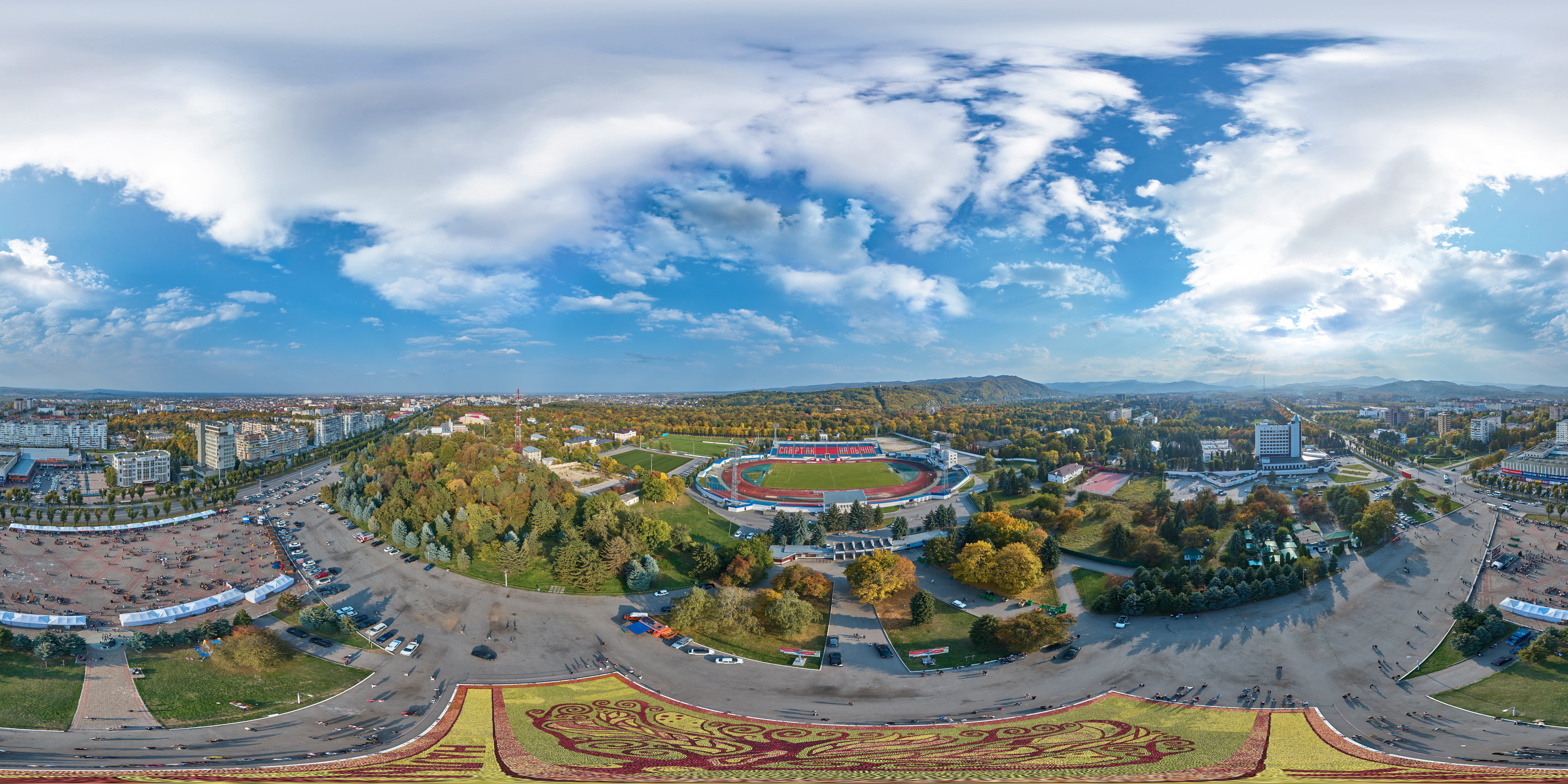 Огромное панно из вкуснейших яблок украсило главную площадь Нальчика. На создание необычной картины понадобилось 40 тонн яблок. Панно выложили студенты колледжа дизайна, им помогали волонтеры.
