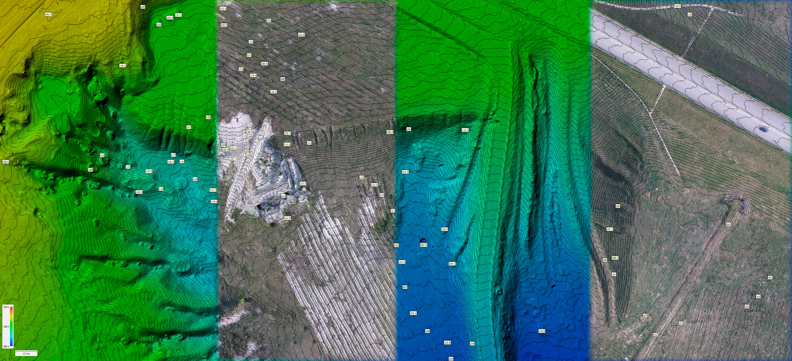 Площадная аэрофотосъёмка с квадрокоптера, с последующим созданием ортофотоплана (разрешение 4 см/пикс), построением цифровой модели рельефа (ЦМР) и горизонталей (сечение рельефа 0,5м), перепад высот 55м - от 100 м до 155 м. Площадь съёмки 0,5 кв. км (50 га), время съёмки около 20 минут (1 полёт квадрокоптера), время обработки 12 часов.