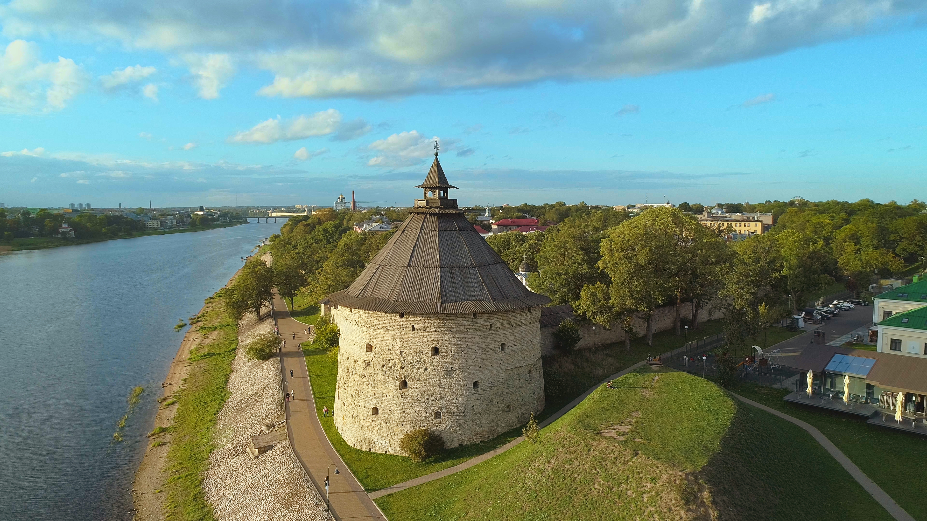 Вид на набережную реки Великой от Покровской башни в 2020 году (стоп-кадр из видео).