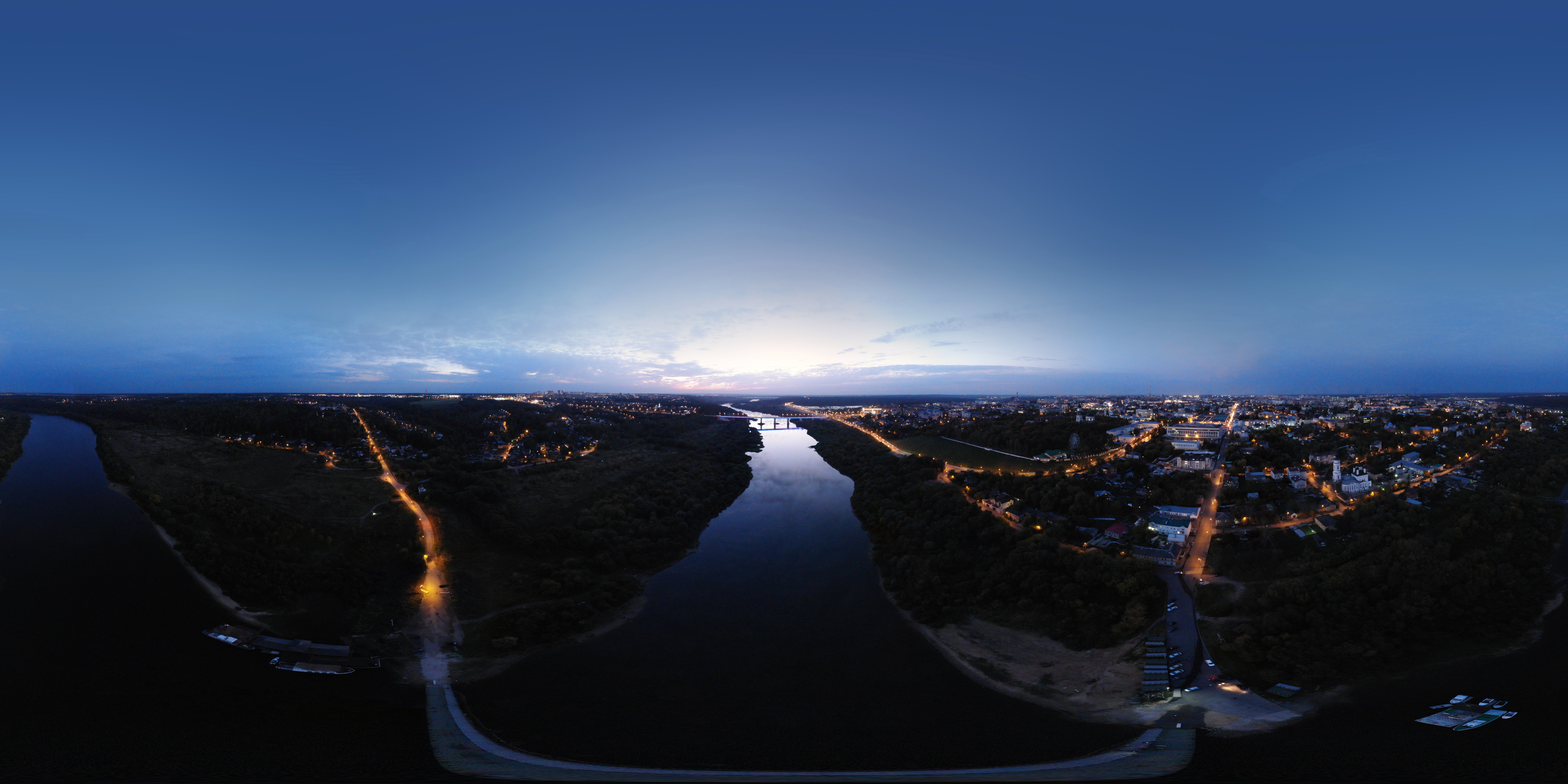 Вечерняя 360 градусов панорама снятая над понтонным пешеходным мостом через р. Оку в Калуге.