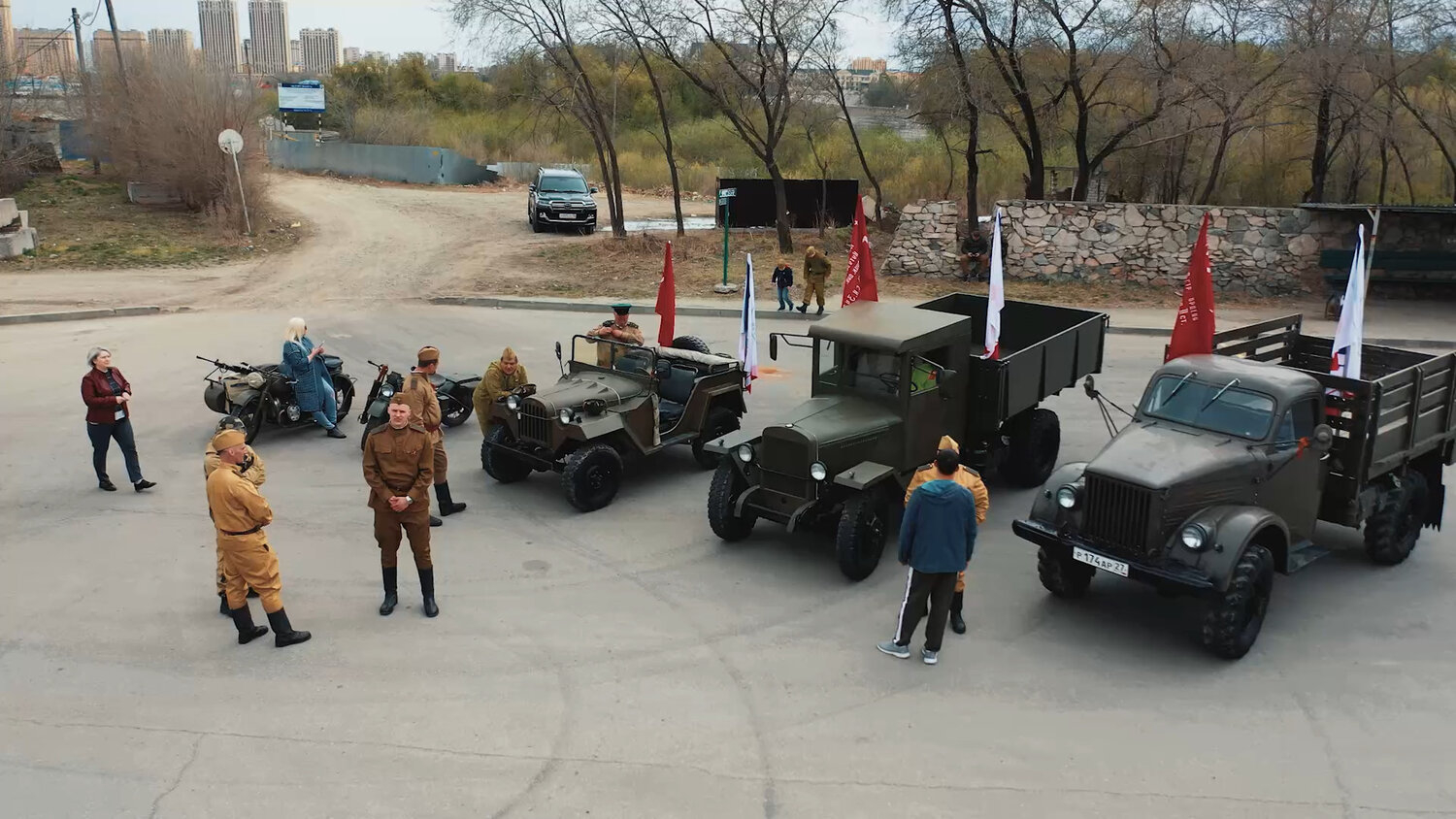 Съемка военно-патриотического ролика, съёмка движения колонны техники по городу