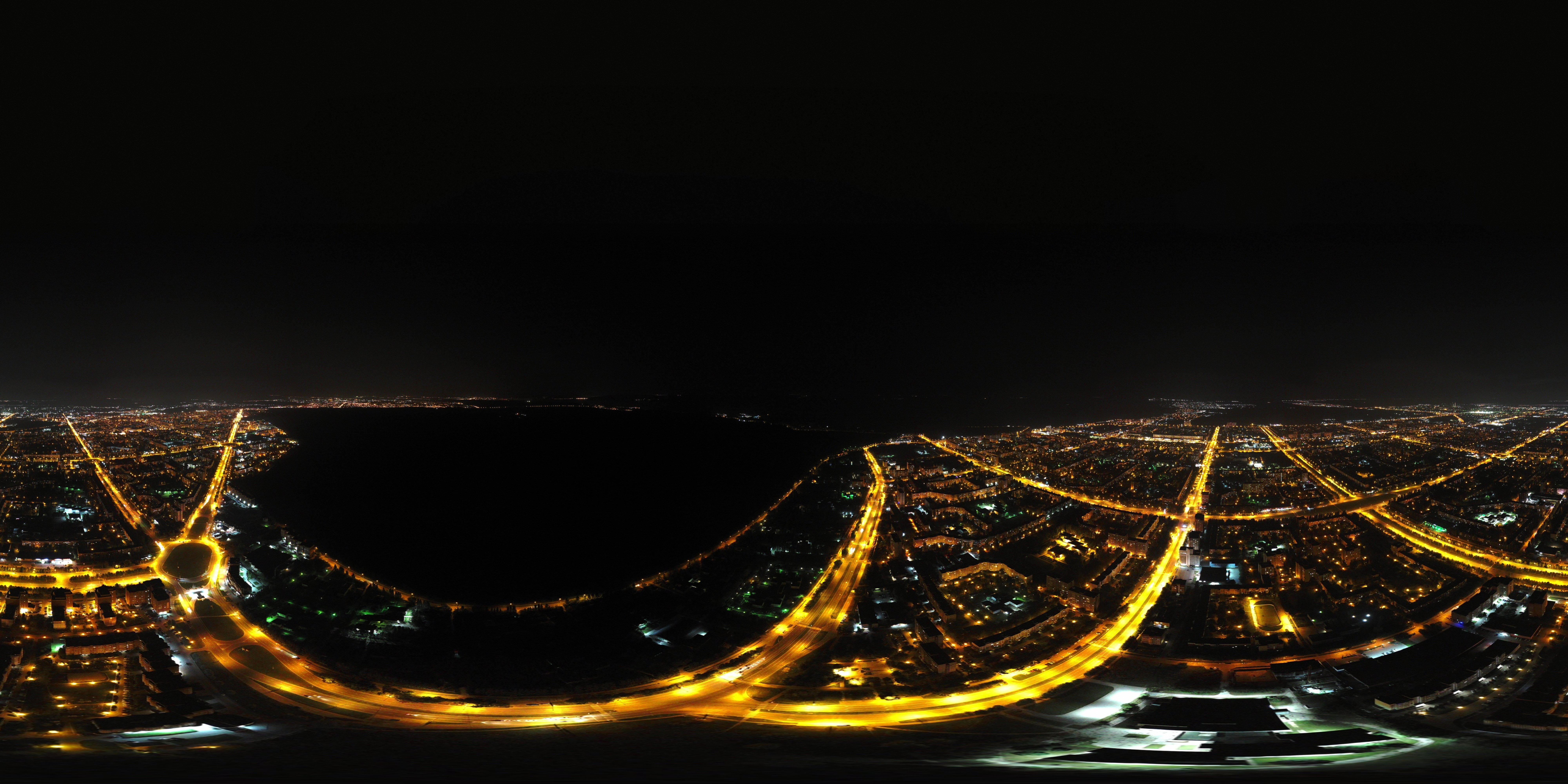 Обзорная панорама ночного г. Тольятти с высоты с видами на лес и несколько раонов города.
