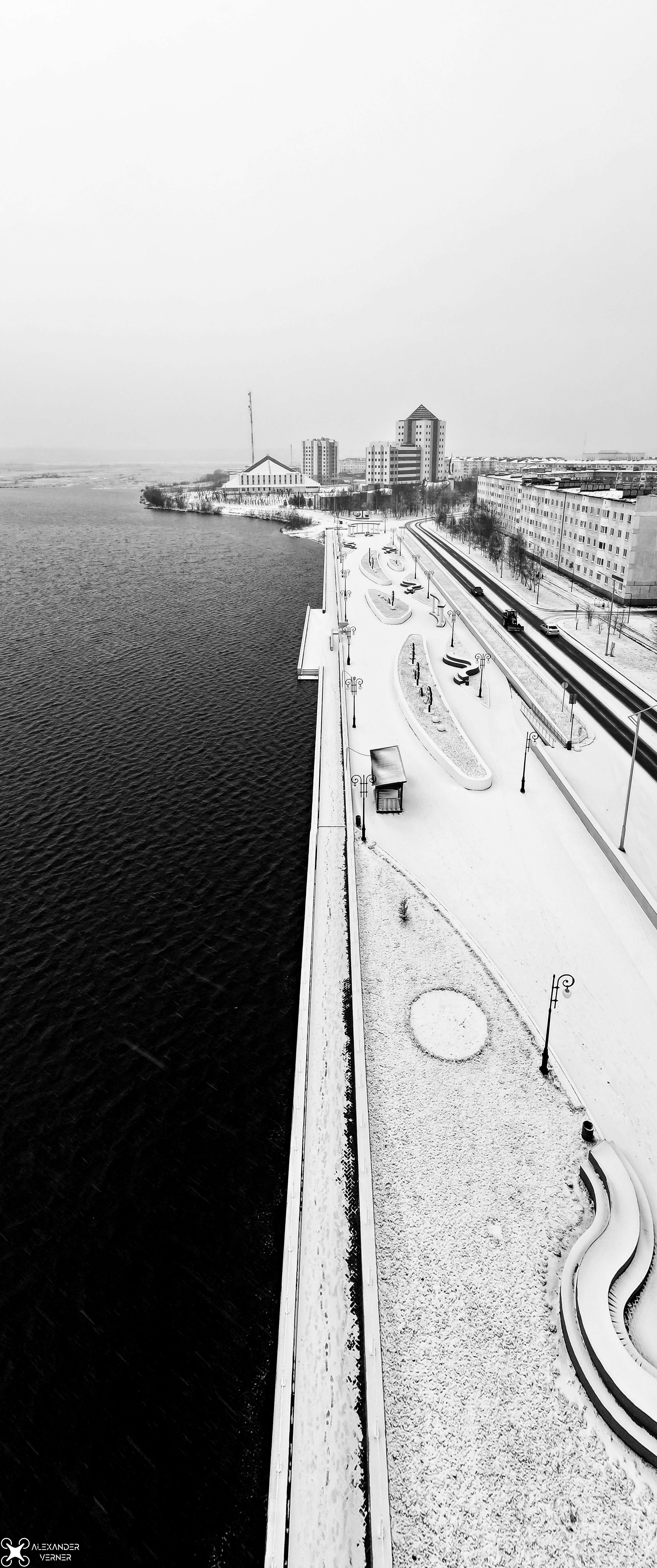 Вертикальная панорама первого снега в Надыме. Городская набережная.