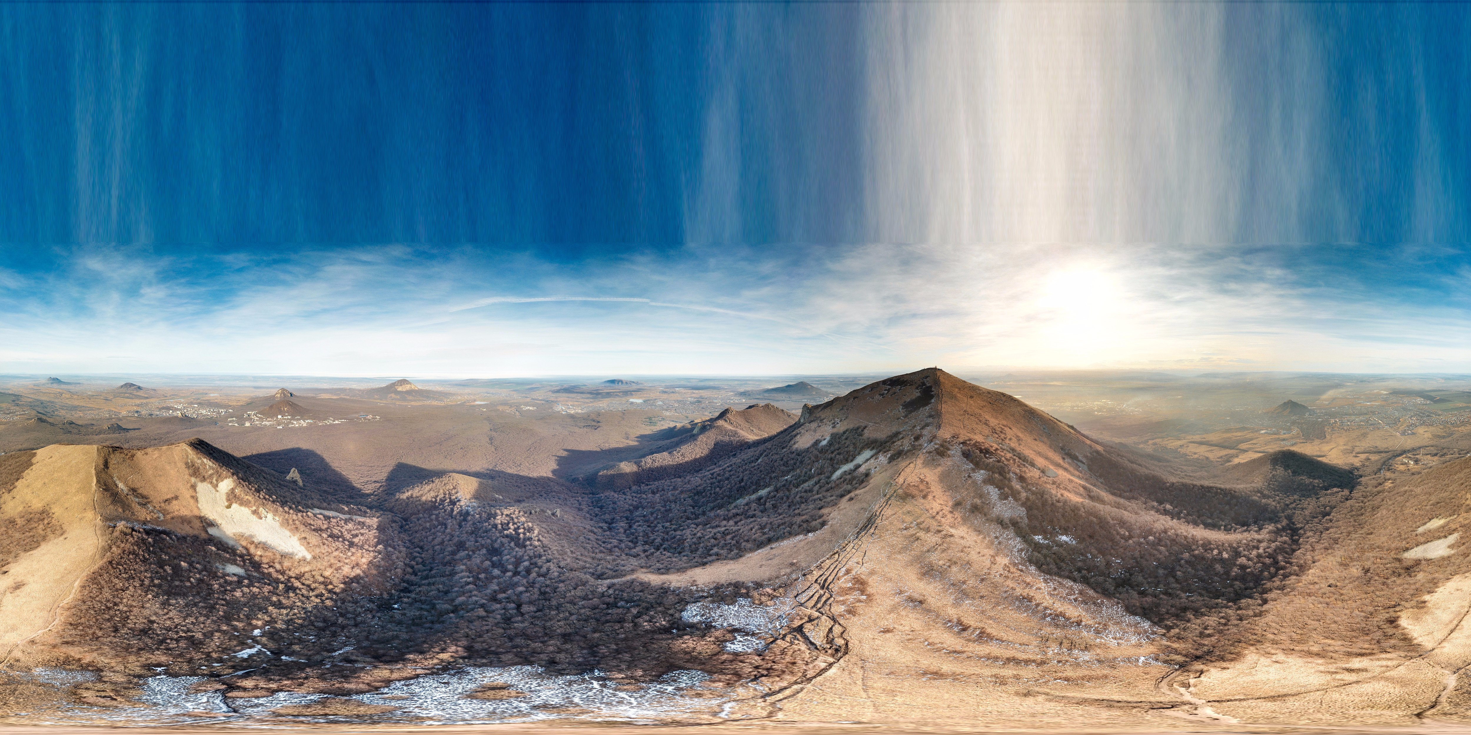 Сеъмка дроном DJI Mavic Pro с седловины горы Бештау. На снимке видны все окресные горы Пятигорска, Лермонтаова и Железноводска. Этиже города и окружают г. Бештау.