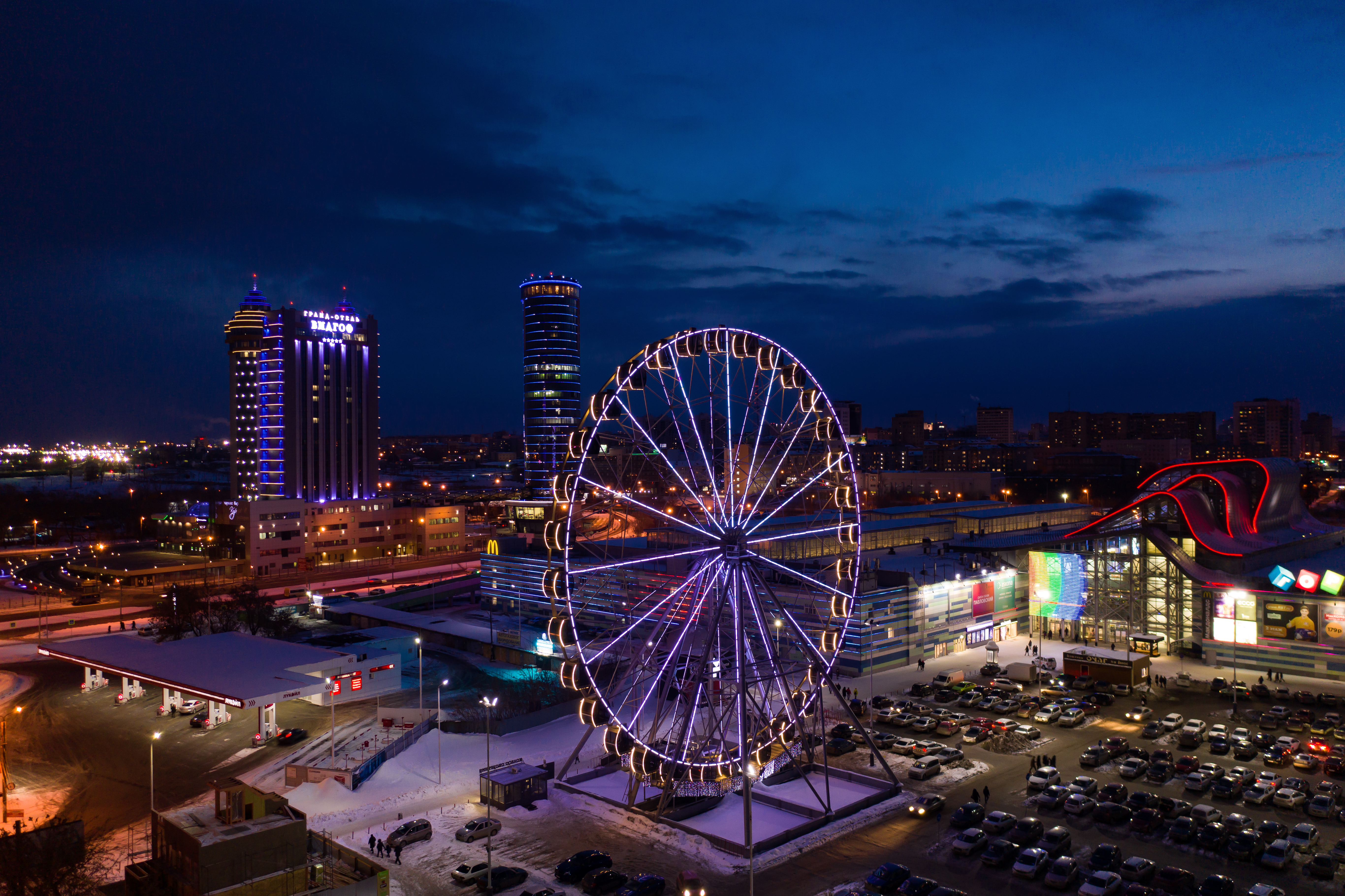 Ночной Челябинск. Вид на ТРК Горки, отель Видгоф.